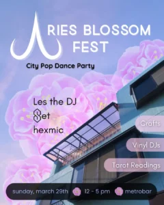 The days are getting longer, the breeze is feeling warmer, and the last bit of snow has finally kicked the curb. It’s Aries and Cherry Blossom season, so it is time to embrace new beginnings and play outside! Come celebrate the arrival of Cherry Blossom season and Aries Season at metrobar on Sunday, March 29th from 12 – 5pm!