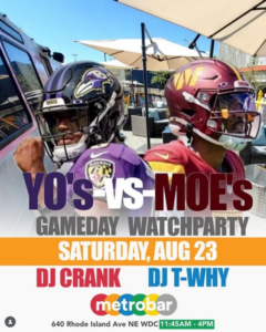 We’re continuing our 2025 Commanders season kickoff with a Preseason Watch Party vs. the Ravens, featuring DJ Crank and DJ T-Why! Come rep your side – Yo’s or Moe’s – as we turn up for the ultimate DMV showdown, Saturday morning at an early 11:30am opening. Enjoy the game on TVs around the bar — rock your Washington gear and get ready to raise HAIL! We’ll have specials on official Commanders 1932 Bourbon from Arthur Wheeler Spirits and other drinks for the game, plus food trucks onsite and beats from DJs Crank and T-Why all day!