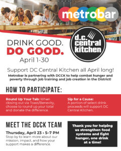Support DC Central Kitchen all April long! metrobar is partnering with DCCK to help combat hunger and poverty through job training and job creation in the District!