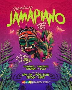 Jamapiano outdoor dance party with Grandiose Group at metrobar on Saturday, July 12th! JAMAPIANO merges Dancehall, Reggae, and Amapiano into a fresh, distinctive sound. Caribbean rhythms meet South African beats, creating a whole new vibe. Party goes from 5pm – 12am with free entry before 6pm with RSVP via Grandiose Group’s Eventbrite.
