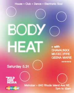 We’ve got a stacked line up with music from DJs Muse(O)fire, SHAVAUNXX, and Geena Marie! Expect house, club, dance music, and electronic soul all night! 7pm to 12am at metrobar. Two great bars, and amazing indoor/outdoor seating to enjoy the weather and the music! Let’s turn up the HEAT!