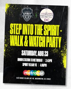 And check out the “Step Into the Spirit: Walk and Watch Party“. Join the Spirit along with City Girls DC on Saturday, August 23 for a full afternoon of activities! They’re kicking things off with a Spirit Walk with City Girls DC starting at Union Station and walking to the official watch party at metrobar for the team’s match against Bay FC. The first 100 walkers to check in at Union Station will receive a limited-edition Washington Spirit wine cup and PK the Eagle will be on-site for photos and good vibes before we set off.