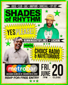 RUNNINGOUTTHELINES and metrobar DC launch a brand-new party series called Shades of Rhythm. From 7pm-12am, we’ll celebrate music that feels both familiar and fresh—sounds that connect us while inviting us into something new.