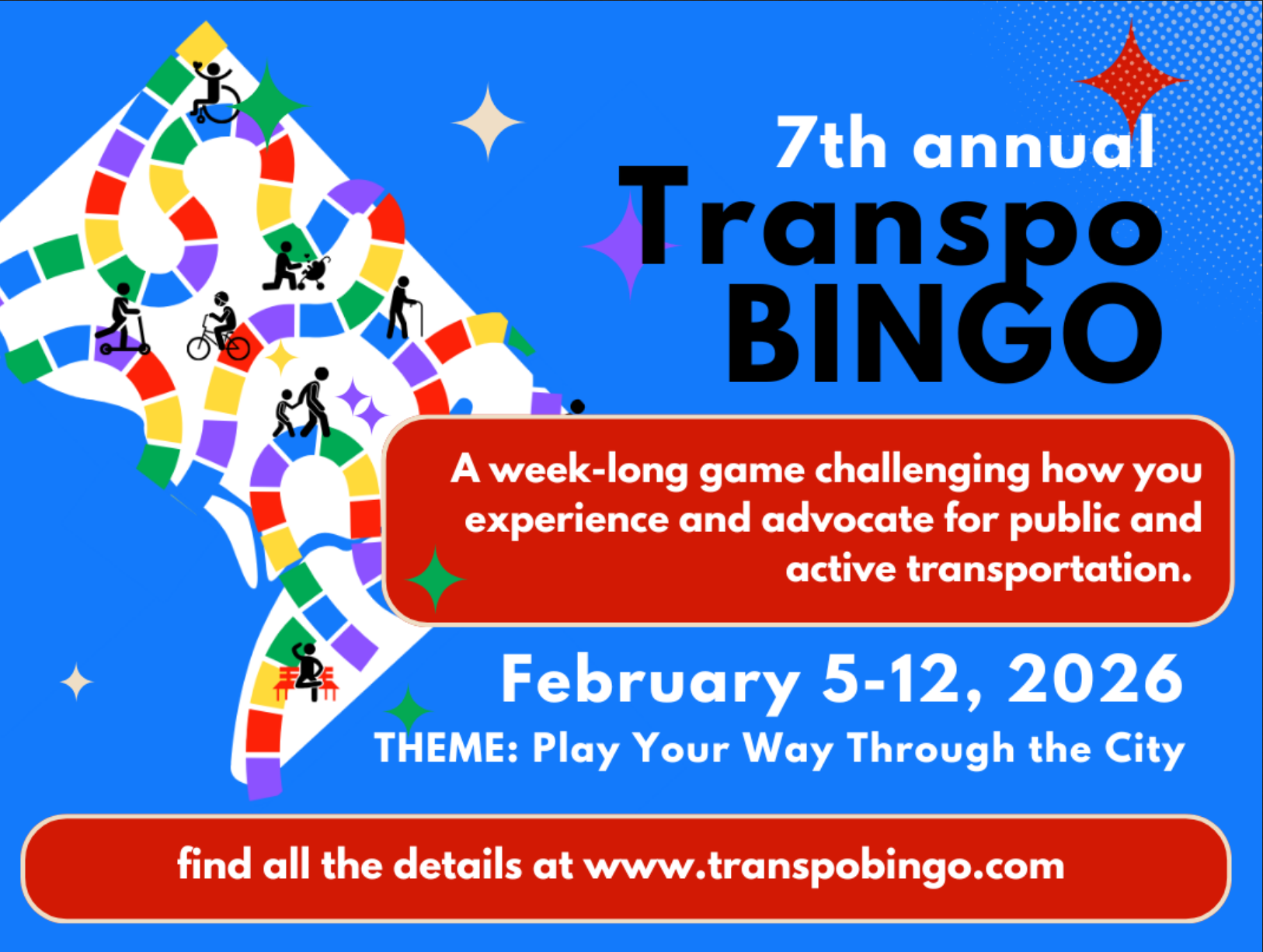 Celebrate the kickoff of #TranspoBINGO, connect with fellow players, share experiences, and discuss how we can continue advocating for better, more inclusive public transportation. Join us on February 5th for a fun, social evening as we kick off 2026 #TranspoBINGO with a special TranspoBINGO x MBTPubRoll x metrobar event. We’ll bike through DC, hit bars, earning squares while exploring the city and supporting active transportation!