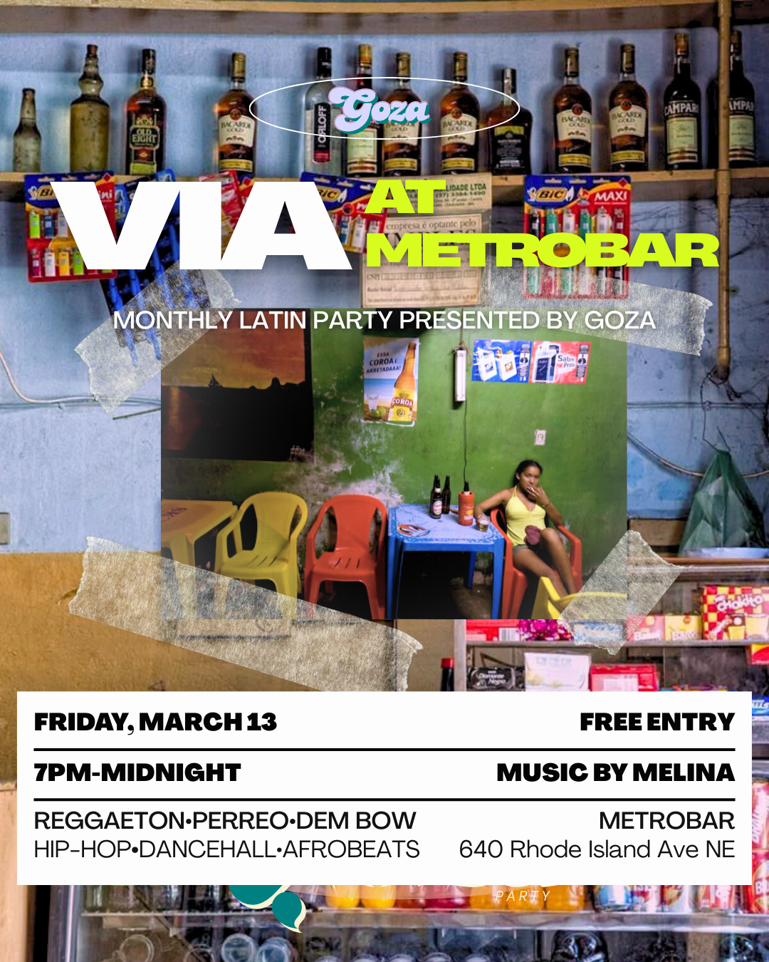 Curated by DJ Melina, Via is a fusion of Afro-Caribbean and Latin music influences intersecting with the sounds that shaped a generation of first-gen Latinos in the DMV. We’re not from here, but we’re not from there either—we exist in the in-between. Raised by immigrants yet deeply shaped by the sounds, style, and cultural influence of Black America—hip-hop, R&B and soul music. At the same time, American pop culture shaped our upbringing—VH1, TRL, and 97.1 FM in DC filled our screens and airwaves, creating the soundtrack of our youth. Goza is a space where our dual identities thrive, where nostalgia meets discovery, and where we dance to the rhythms that define us—and to the music that will define us.