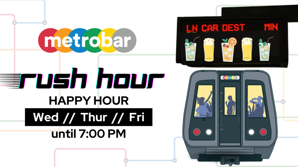 Join us for our RUSH HOUR Happy Hour at metrobar, with specials available every Wednesday & Thursday from 5-7pm, and Friday from 4-7pm! Skip the weekday commute and go straight to happy hour inside our heated 125-seat railcar bar & lounge or at our fireside lounge, chalets, and campfire bar, with specials on local drafts, craft cocktails, bottles of wine, and more featured specials weekly!